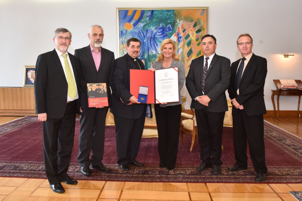 - Zagreb, 24. svibnja 2018. (IBA) - Peteročlano izaslanstvo crkava organizatorica obilježavanja pet stotina godina Protestantske reformacije posjetilo je predsjednicu Republike Hrvatske, gđu. Kolindu Grabar-Kitarović kako bi joj zahvalilo na pokroviteljstvu nad Svečanom akademijom. U pratnji predsjednice bila je njena savjetnica Renata Margetić Urlić.